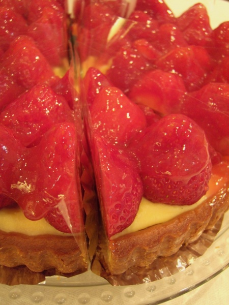 バターの香りのさくさくタルトにアーモンドクリーム、カスタードを絞り、その上にいちごをたっぷりのせて、自家製あまおうのジュレをかけます。毎年大人気の商品です。